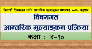 विद्यार्थी सिकाइका लागि आन्तरिक मूल्याङ्कन मापदण्ड २०८० अनुसार विषयगत आन्तरिक मूल्याङ्कन प्रक्रिया कक्षा ४–१० Download File