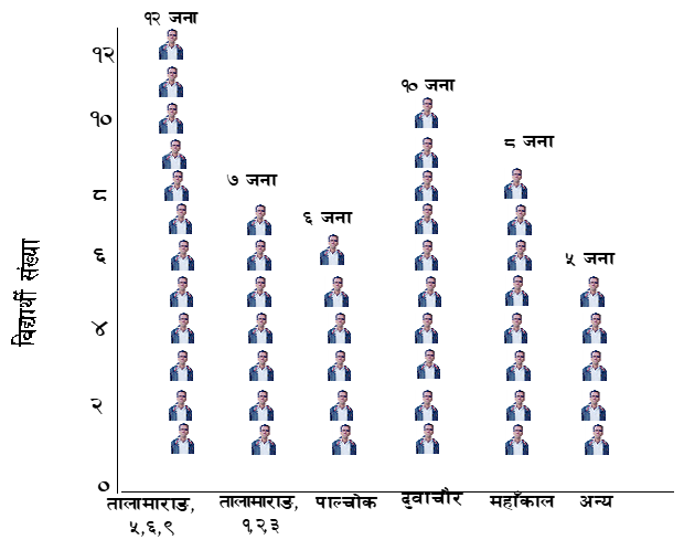 विद्यार्थीलाई संख्यात्मक विवरण, स्तम्भको लम्बाइ वा आकार र स्केलको सम्बन्ध देखाउन सबै विद्यार्थीलाई बाहिर निकाली भेगीय हिसाबले आएका विद्यार्थीलाई अलग अलग बराबर दुरीमा राखी कुन ठाउँबाट आउने कतिजना विद्यार्थी मिलेर कति लामो लाइन भयो विश्लेषण गर्न लगाइयो जसबाट चित्रको आकार यस्तो बन्यो ।
